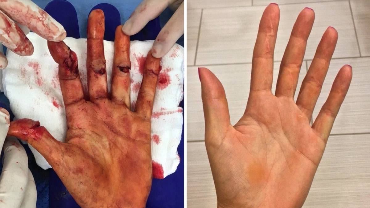 Το -αντίστοιχο- 166 της πόλης της δέχθηκε κλήση “για μια 26χρονη τραυματισμένη γυναίκα”. Μεταφέρθηκε σε νοσοκομείο στο Brno, όπου της εξήγησαν πως θα έπρεπε να μπει αμέσως στο χειρουργείο, για να προλάβει την ανεπανόρθωτη ζημιά. Η επέμβαση διήρκεσε 3 ώρες και 45 λεπτά “και οι γιατροί διόρθωσαν το πρόβλημα που είχε προκληθεί στους τένοντες και των πέντε δαχτύλων, αλλά και αυτά που διαπιστώθηκαν σε δυο νεύρα”, όπως έγραψε η εκπρόσωπος της, Katie Spellman σε email που έστειλε στο CNN.