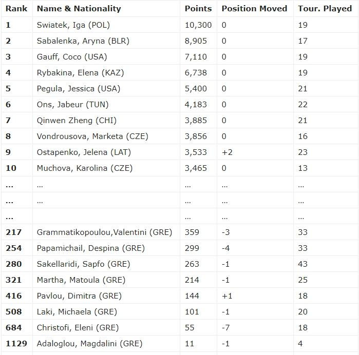 Η Μαρία Σάκκαρη έπεσε στο Νο11 στην παγκόσμια κατάταξη της WTA Rankings και για πρώτη φορά μετά το 2021 είναι εκτός της κορυφαίας δεκάδας της κατάταξης.