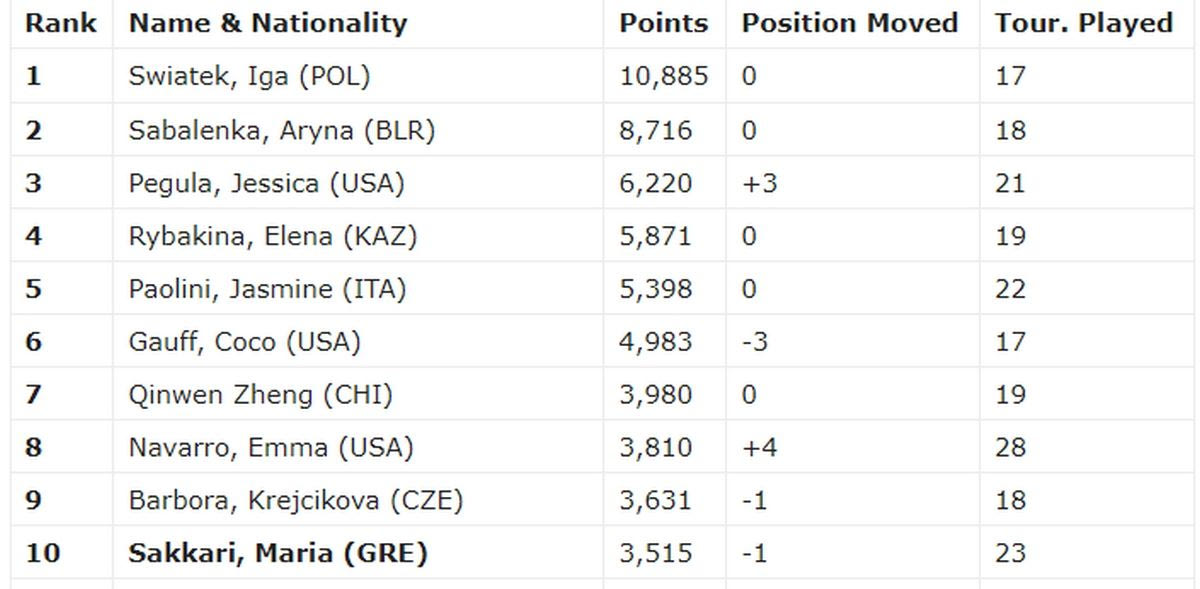 Η Μαρία Σάκκαρη υποχώρησε μία θέση στην παγκόσμια κατάταξη του γυναικείου τένις, καταλαμβάνοντας πλέον το Νο10 της WTA Rankings.