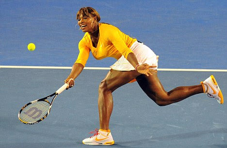 US tennis player Serena Williams plays a stroke during a charity tennis exhibition organised by Swiss tennis player Roger Federer for the victims of the Haiti earthquake, a day before the start of the Australian Open tennis tournament in Melbourne on January 17, 2010. At least 50,000 people have been killed and 1.5 million left homeless in the Caribbean nation and Federer said he wanted to do something to help. The Australian Open will take place on January 18-31. AFP PHOTO / WILLIAM WEST (Photo credit should read WILLIAM WEST/AFP/Getty Images)