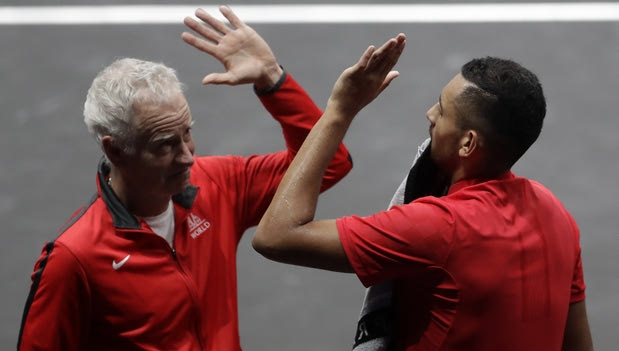 World's Nick Kyrgios clap hands with his team's captain John McEnroe during the Laver Cup tennis match against Europe's Tomas Berdych in Prague, Czech Republic, Saturday, Sept. 23, 2017. (AP Photo/Petr David Josek)