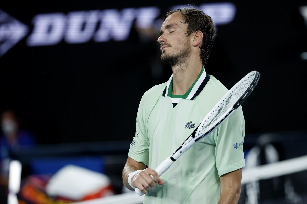Daniil Medvedev of Russia reacts during his match against Rafael Nadal of Spain in the men's singles final at the Australian Open tennis championships in Melbourne, Australia, Sunday, Jan. 30, 2022. (AP Photo/Hamish Blair)
