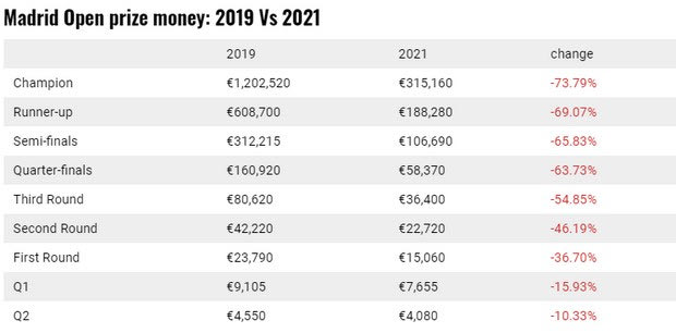 Το Madrid Open είναι το πιο διάσημο ισπανικό τουρνουά και συγκεντρώνει τα βλέμματα των απανταχού φίλων του τένις, το χρονικό διάστημα που διεξάγεται. Παρ’ όλα αυτά, το prize pool που ανακοίνωσαν οι διοργανωτές για το 2021, δεν έχει καμία σχέση με αυτό του 2019.