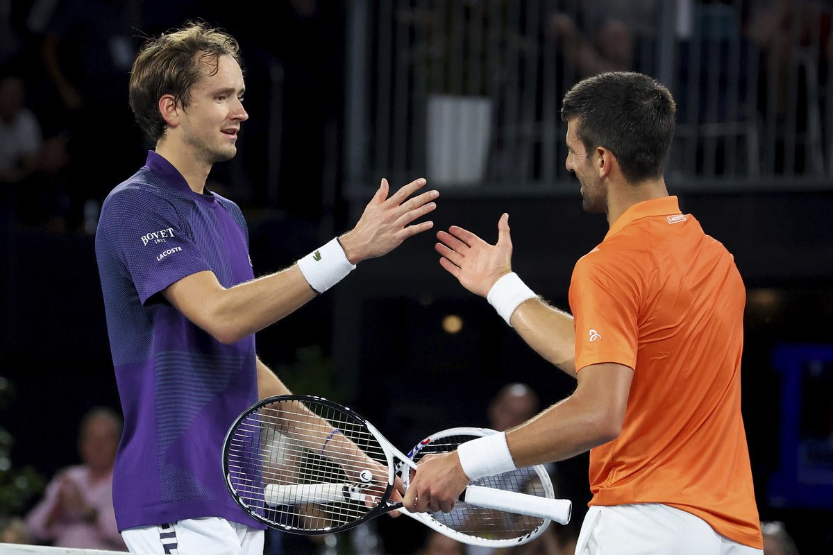 Serbia's Novak Djokovic is congratulated at the net after defeating Russia's Daniil Medvedev during their semi final match at the Adelaide International Tennis tournament in Adelaide, Australia, Saturday, Jan. 7, 2023. (AP Photo/Kelly Barnes)