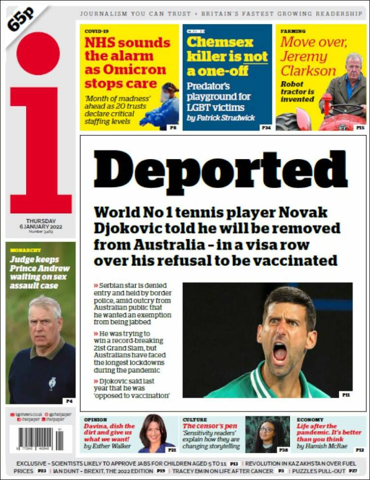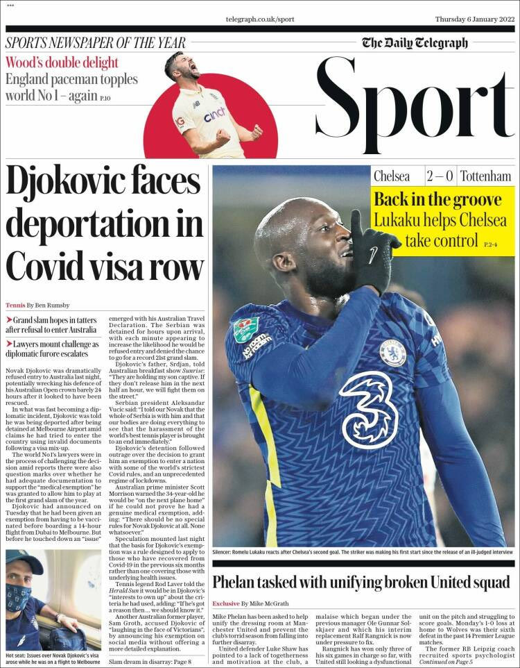Ως εκ τούτου, όπως όλα δείχνουν ο Σέρβος θρύλος του τένις δεν θα μπορέσει να υπερασπιστεί τον τίτλο του στο φετινό Australian Open. Την ίδια στιγμή, το επεισοδιακό 24ωρο που πέρασε ο Τζόκοβιτς, όπως ήταν λογικό, αποτελεί το Νο1 θέμα στον ξένο Τύπο. Πολλές εφημερίδες αφιέρωσαν την Πέμπτη (6/1) τα πρωτοσέλιδά τους στον Σέρβο και τα όσα συνέβησαν στην Μελβούρνη.