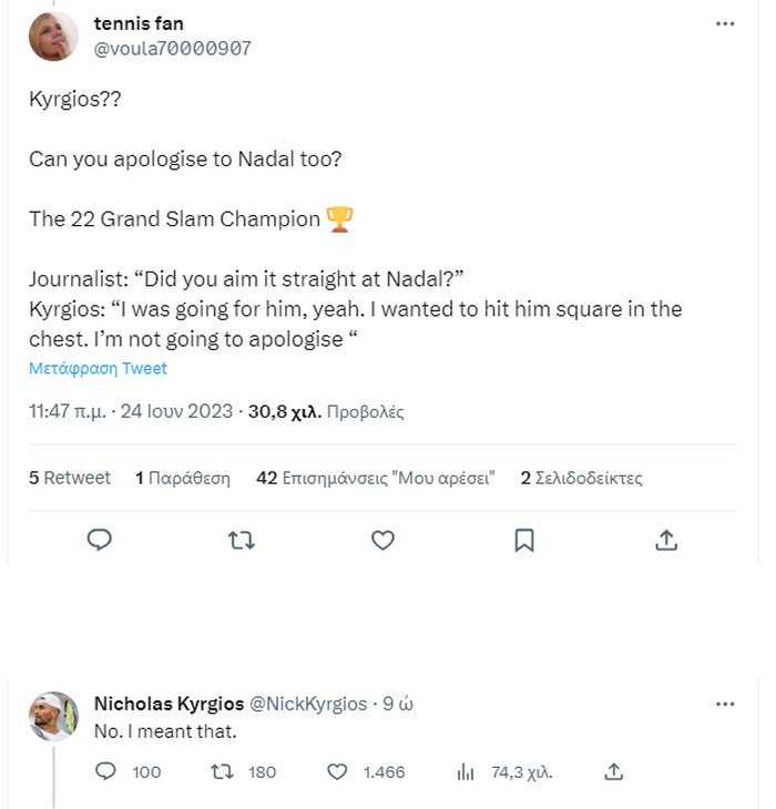 Το ίδιο συνέβη και αυτή τη φορά. Σε σχετική ερώτηση που δέχτηκε στο twitter όπου κάποιος χρησιμοποίησε εκείνη την ατάκα του, ο Νικ Κύργιος ότι όσα είπε τότε τα εννοεί.