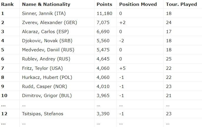 Ο Γιάνικ Σίνερ, ο νικητής του τουρνουά, μεγάλωσε τη διαφορά από τους διώκτες του κι απέκτησε προβάδισμα για πρώτη φορά στην καριέρα του με 11,180 πόντους.