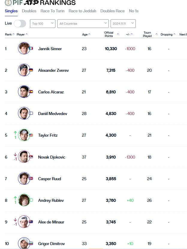 Ο Σέρβος έχασε 1.300 βαθμούς, καθώς δεν πήγε στο Τορίνο για να υπερασπιστεί τον τίτλο του στο ATP Finals και έτσι έπεσε στους 3.910 βαθμούς. Ο Κάσπερ Ρουντ είναι στο Νο7, ο Άντρεϊ Ρούμπλεφ στο Νο8 και ο Άλεξ ντε Μινόρ στο Νο9.