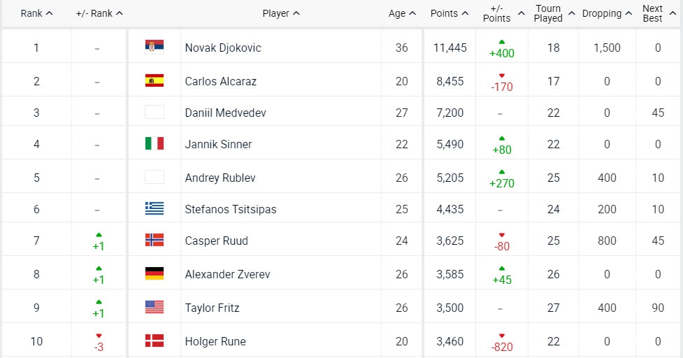 Το Top6 παρέμεινε αναλλοίωτο, με τον Ντανίλ Μεντβέντεφ να βρίσκεται στο Νο3, τον Γιανίκ Σίνερ στο Νο4, τον Άντρεϊ Ρούμπλεφ στο Νο5 και τον Στέφανο Τσιτσιπά στο Νο6.