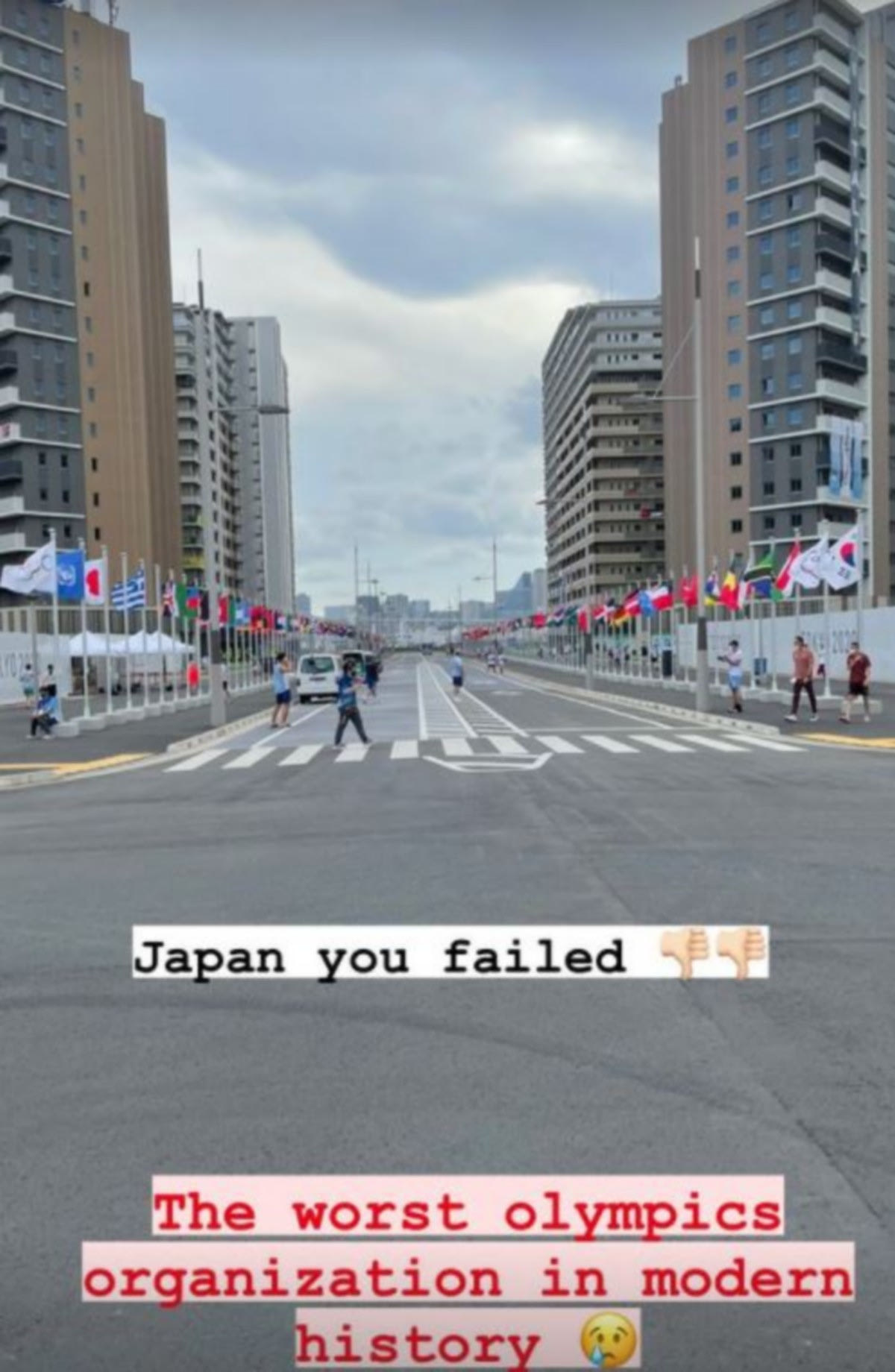“Η διαμονή είναι άθλια και όχι δίκαιη για όλες τις χώρες. Μέναμε τρία άτομα σε 20 τ.μ. σε κρεβάτια φτιαγμένα από χαρτόνι. Δεν είχαμε καν τηλεόραση για να δούμε τους Αγώνες. Την ίδια ώρα ΗΠΑ και Ηνωμένο Βασίλειο και κανά δυο χώρες ακόμα είχαν playstation και μεγάλα διαμερίσματα με μεγάλα παράθυρα, με ιδιωτικά γυμναστήρια, με ηλεκτρικά ποδήλατα και χώρους για καφέ. Το 90% των υπαλλήλων της διοργάνωσης δεν μιλούσαν αγγλικά. Τόσο χάος για να τακτοποιηθούν τα πράγματα. Το φαγητό δεν είναι για Ολυμπιονίκες. Το πλυντήριο είναι άθλιο, χάνονται ρούχα, και ξοδεύουμε ώρες στην ουρά για να ξεχωρίσουμε τα ρούχα. Δεν έχουμε είδη πρώτης ανάγκης, όπως σαπούνι για τα χέρια, σαμπουάν, οδοντόκρεμα κτλ. και το κατάστημα στο Χωριό ήταν άχρηστο. Στο γυμναστήριο οι άνθρωποι περπατάνε δίπλα σου και σου σπάνε τα νεύρα να κρατήσει τη μάσκα φορεμένη την ώρα που κάνεις την άσκηση.” ανέφερε συγκεκριμένα.