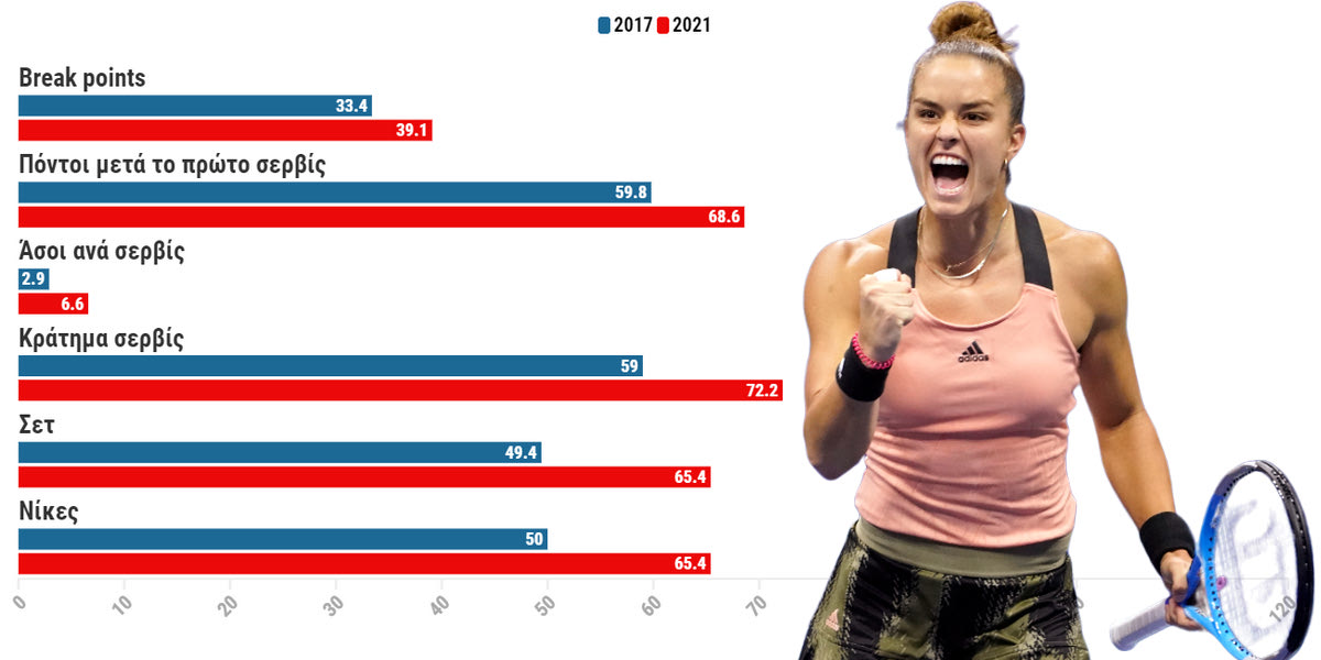 Για αυτό το λόγο στο γράφημα που θα δείτε έχουμε ως αντιπαραβολή τι έκανε μέχρι το 2017 και τι έκανε το 2021 για να έχετε μια πιο ξεκάθαρη εικόνα. Η Μαρία Σάκκαρη μέχρι τότε κρατούσε το σερβίς της σε ένα ποσοστό το οποίο ήταν περίπου στο 58%, τη χρονιά που ολοκληρώθηκε το συγκεκριμένο νούμερο έφτασε στο 72,2%!