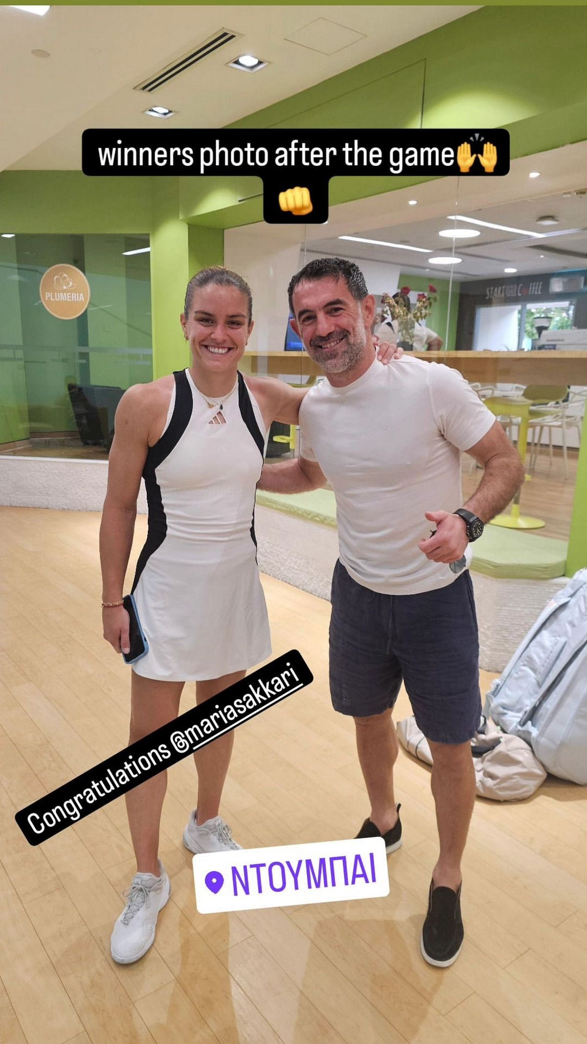 Στο πλευρό της Σάκκαρη για να παρακολουθήσει το νέο ξεκίνημα μετά τη διακοπή της συνεργασίας της με τον επί έξι χρόνια προπονητής Τομ Χιλ, βρέθηκε ο Γιώργος Καραγκούνης, με τους δύο τους να έχουν ένα τετ α τετ μετά το φινάλε της αναμέτρησης και να βγάζουν μια πανηγυρική φωτογραφία.