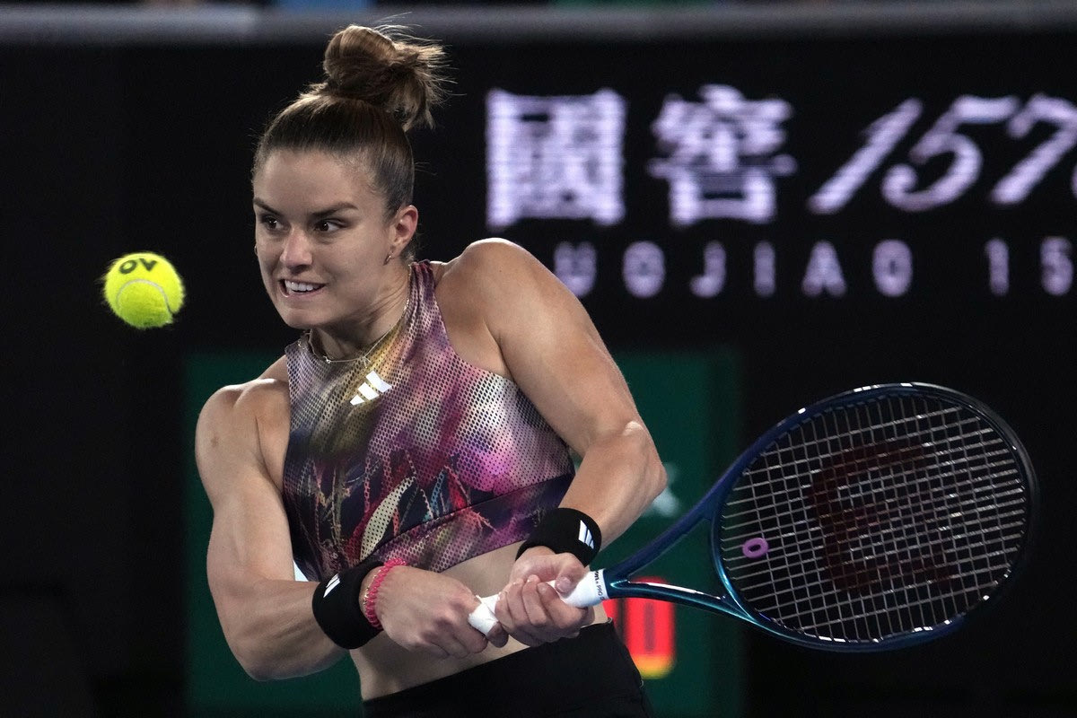 Maria Sakkari of Greece plays a backhand return to Diana Shnaider of Russia during their second round match at the Australian Open tennis championship in Melbourne, Australia, Wednesday, Jan. 18, 2023. (AP Photo/Ng Han Guan)