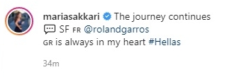 Η Μαρία Σάκκαρη ανέφερε σε ανάρτηση στον προσωπικό της λογαριασμό στο Instagram, αμέσως μετά τη νίκη επί της Σβιόντεκ και την πρόκριση στον ημιτελικό του Roland Garros, ότι "το ταξίδι συνεχίζεται" και φυσικά ότι δεν ξεχνάει στην Ελλάδα.