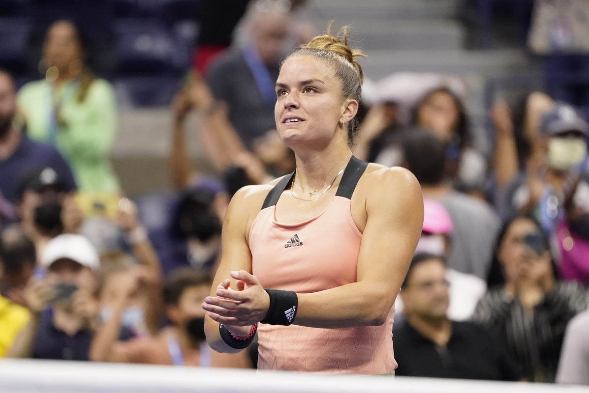 Η Μαρία Σάκκαρη συγκινημένη αμέσως μετά τη νίκη επί της Αντρεέσκου στο US Open © 2021 John Minchillo / AP Images