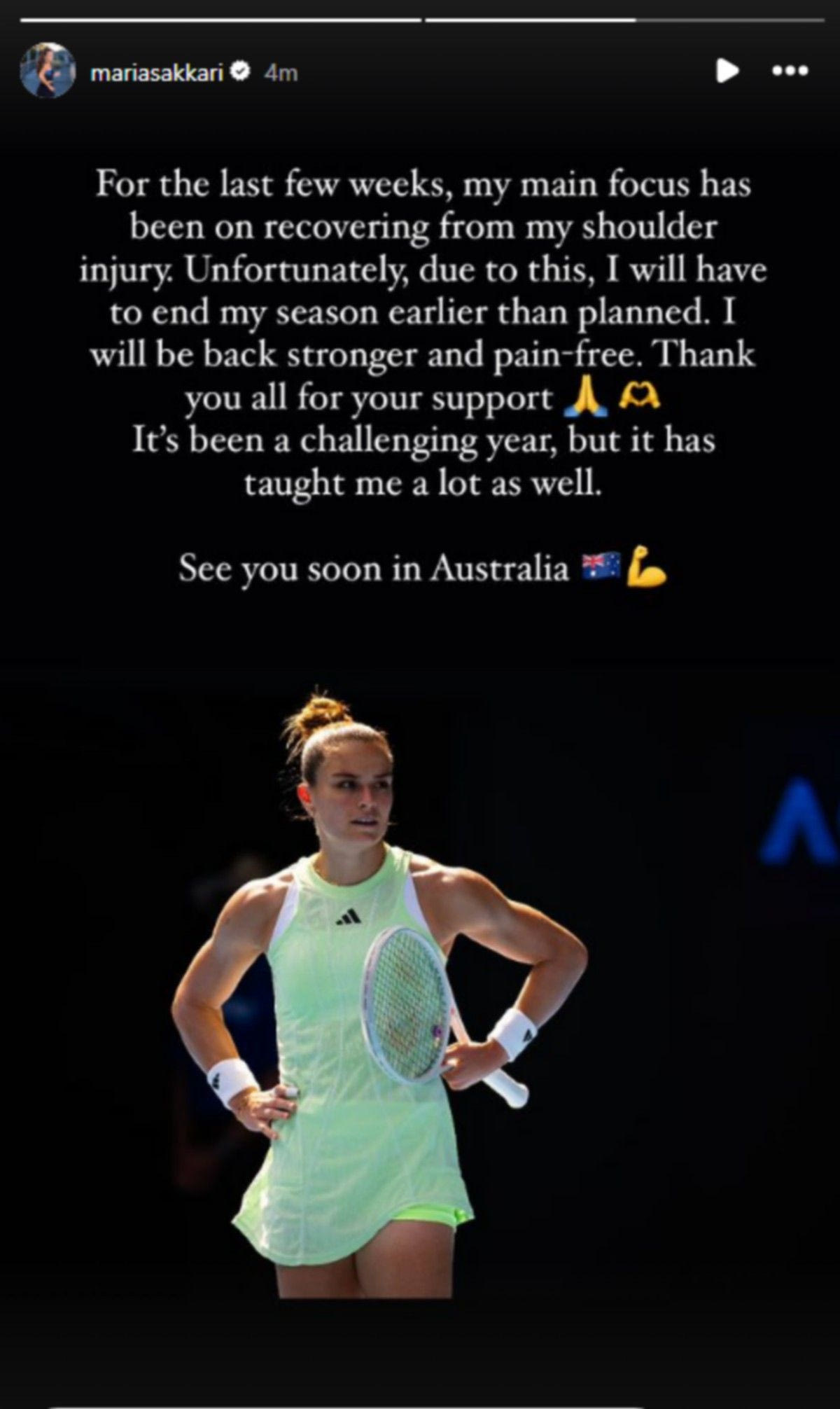 Η Μαρία Σάκκαρη ανακοίνωσε μέσω instagram πως δεν θα συμμετάσχει σε άλλους αγώνες για το 2024 και θα επικεντρωθεί στην αποθεραπεία από τον τραυματισμό της στον ώμο.