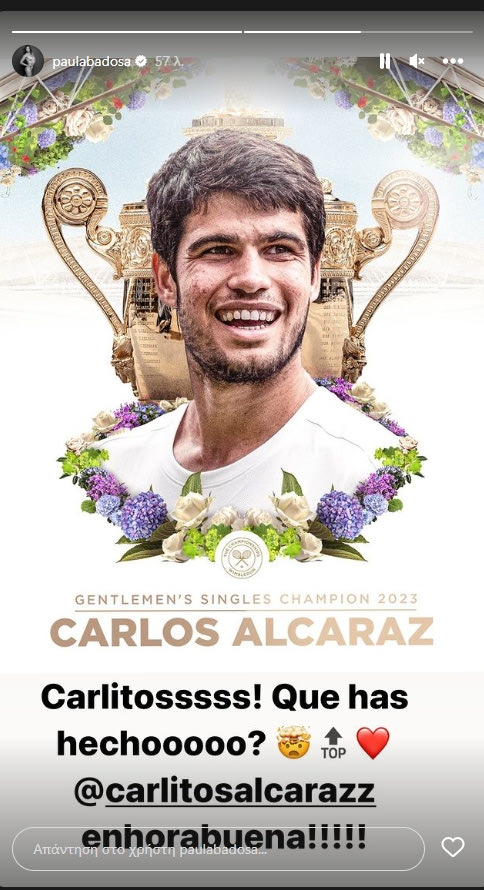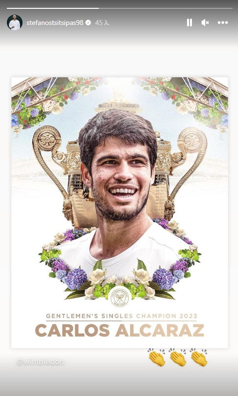 Τα συγχαρητήριά τους στον Κάρλος Αλκαράθ για την κατάκτηση του Wimbledon είπαν μέσα από τα social media τόσο ο Στέφανος Τσιτσιπάς όσο και η Πάουλα Μπαντόσα.