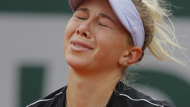Amanda Anisimova of the U.S. reacts after missing a shot against Australia's Ashleigh Barty during their semifinal match of the French Open tennis tournament at the Roland Garros stadium in Paris, Friday, June 7, 2019. (AP Photo/Michel Euler)