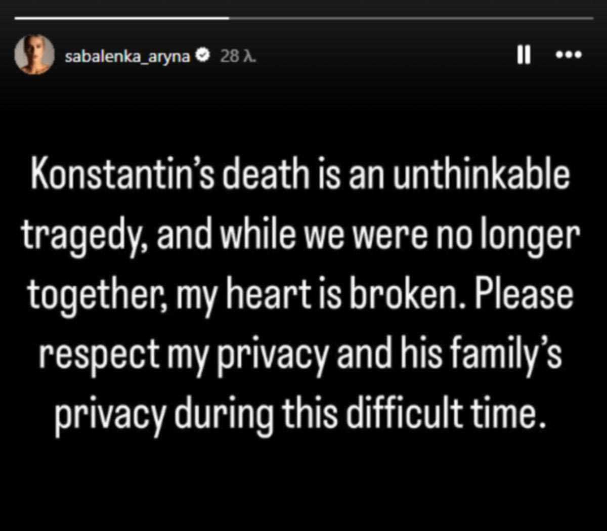 “Ο θάνατος του Κονσταντίν είναι μία ανείπωτη τραγωδία και παρά το γεγονός ότι δεν ήμασταν πια ζευγάρι, η καρδιά μου έχει ραγίσει. Σας παρακαλώ, σεβαστείτε την ιδιωτικότητά μου και την ιδιωτικότητα της οικογένειάς του σε αυτή τη δύσκολη περίοδο” έγραψε η Σαμπαλένκα το βράδυ της Τετάρτης (20/3).