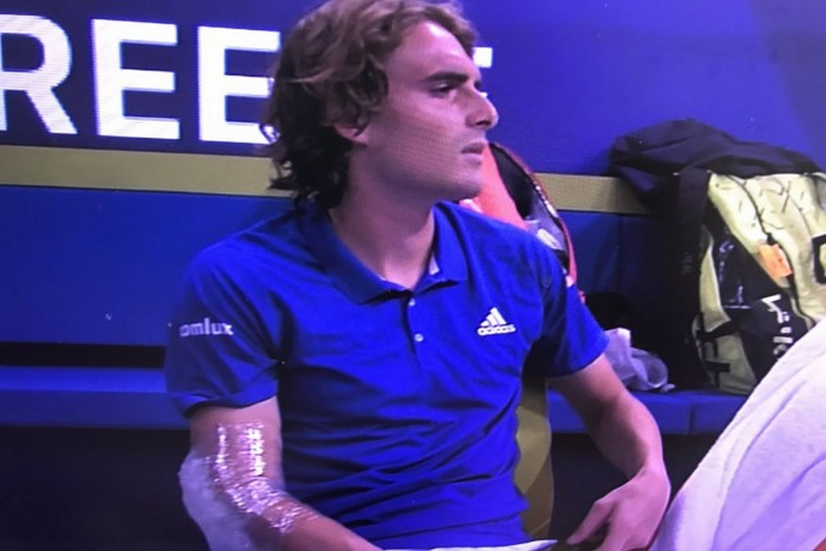 Ο Στέφανος Τσιτσιπάς εμφανίστηκε στο γήπεδο, ήταν στον πάγκο της ελληνικής ομάδας, μόνο που είχε πάγο στο δεξί του χέρι και μάλιστα στο σημείο όπου είχε κάνει την επέμβαση.