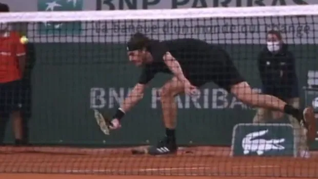 Στο ματς με τον Ντιμιτρόφ βρέθηκε στο χώμα, όμως χωρίς να το θέλει. Στην προσπάθειά του ο να βγάλει άμυνα σε backhand του Βούλγαρου ο Τσιτσιπάς παραπάτησε με αποτέλεσμα να βρεθεί στο έδαφος.