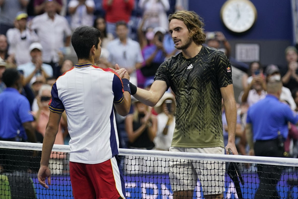 Carlos Alcaraz, left, of Spain, shakes hands with defeating Stefanos Tsitsipas, of Greece, after defeating Tsitsipas during their third round match of the US Open tennis championships, Friday, Sept. 3, 2021, in New York. (AP Photo/Seth Wenig)