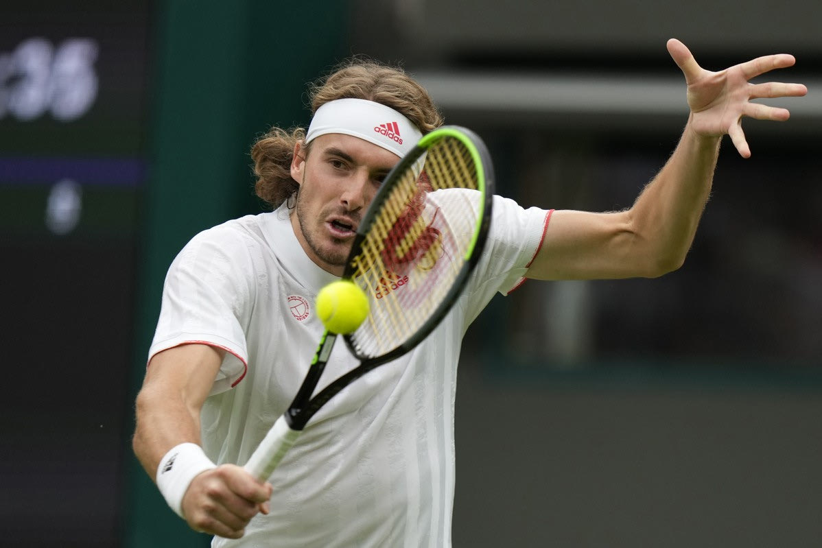 Stefanos Tsitsipas of Greece returns the ball to Frances Tiafoe of the US during the men's singles match on day one of the Wimbledon Tennis Championships in London, Monday June 28, 2021. (AP Photo/Alastair Grant)