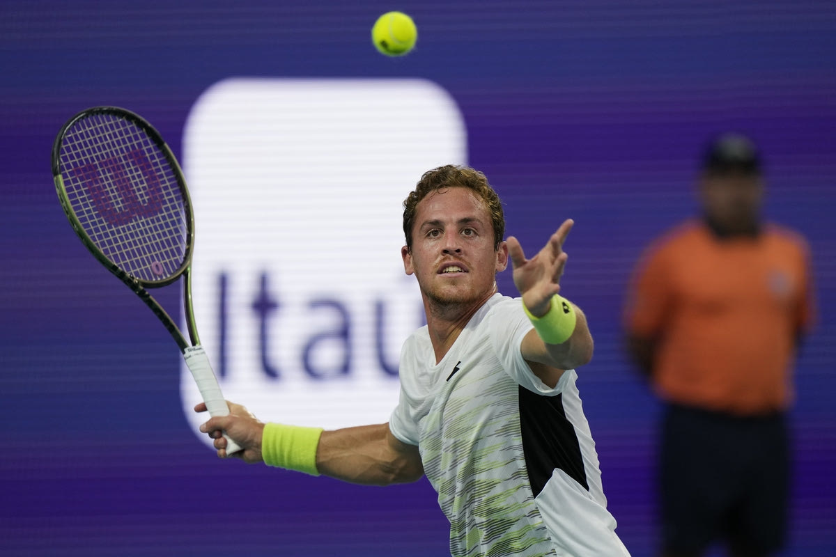 Roberto Carballes Baena, of Spain, returns a shot from Daniil Medvedev, of Russia, during the Miami Open tennis tournament, Saturday, March 25, 2023, in Miami Gardens, Fla. (AP Photo/Wilfredo Lee)