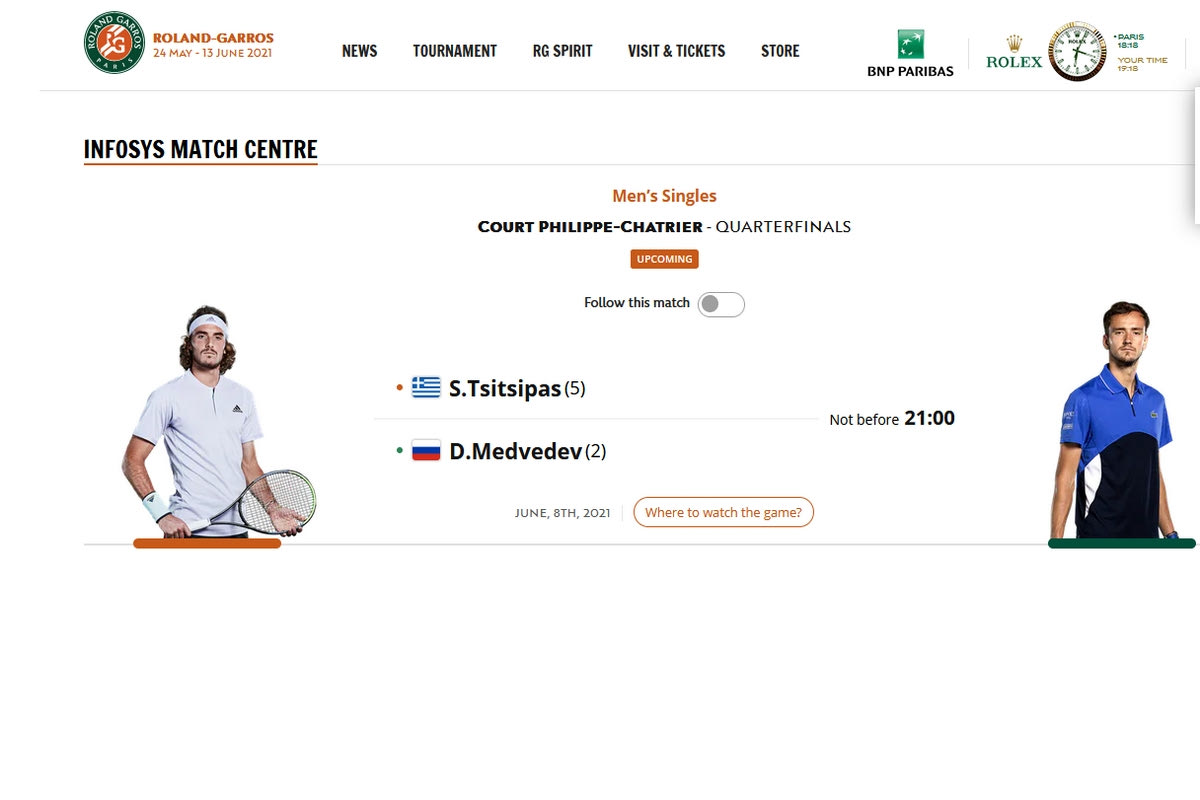 Στο Philippe - Chatrier την Τρίτη (8/6) θα διεξαχθεί ο προημιτελικός του Τσιτσιπά με τον Μεντβέντεφ και θα είναι το τελευταίο ματς στο court, όπερ σημαίνει ότι δεν θα ξεκινήσει πριν τις 22:00, όπως αναφέρουν και οι διοργανωτές του Roland Garros.