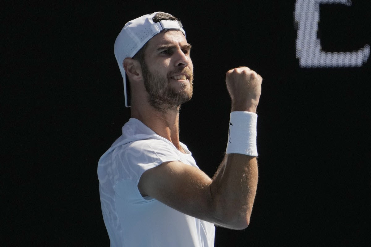 Karen Khachanov of Russia celebrates after defeating Yoshihito Nishioka of Japan during their fourth round match at the Australian Open tennis championship in Melbourne, Australia, Sunday, Jan. 22, 2023. (AP Photo/Ng Han Guan)