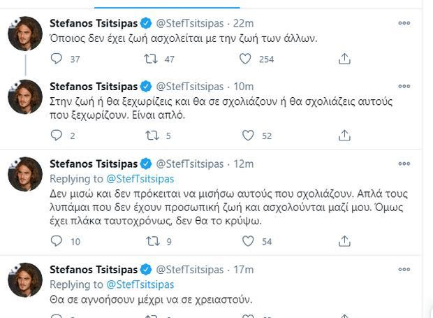 Ο Στέφανος Τσιτσιπάς ξέσπασε μέσω twitter με μία σειρά από posts, γράφοντας μεταξύ άλλων πως όποιος δεν έχει ζωή ασχολείται με την ζωή των άλλων, όπως και ότι λυπάται αυτούς που τον σχολιάζουν.