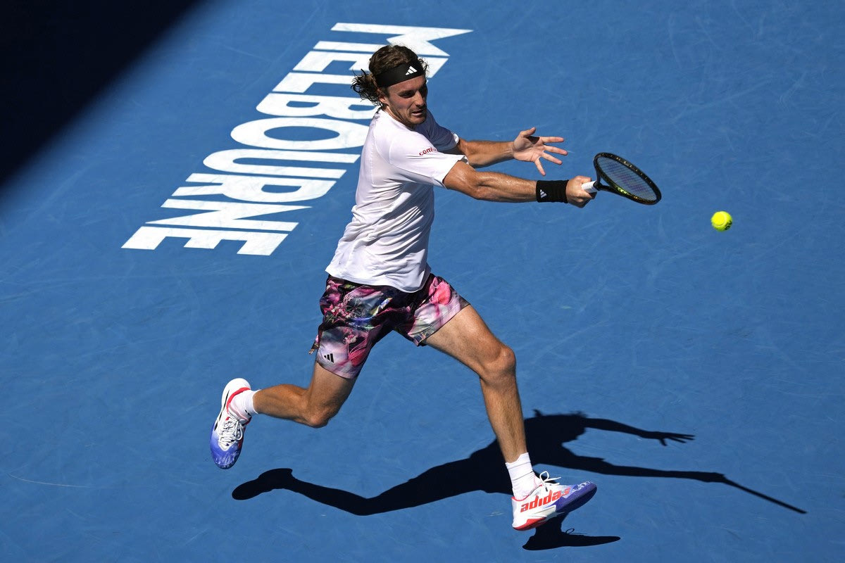 Stefanos Tsitsipas of Greece plays a forehand return to Karen Khachanov of Russia during their semifinal at the Australian Open tennis championship in Melbourne, Australia, Friday, Jan. 27, 2023. (AP Photo/)