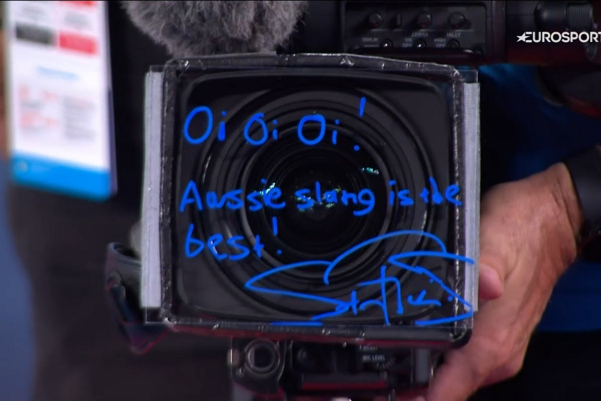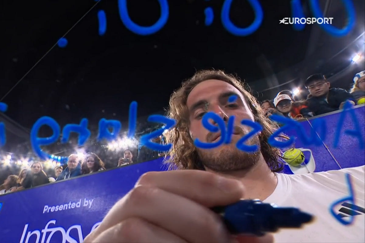 Μετά το τέλος της αναμέτρησης ο Έλληνας τενίστας φρόντισε να αποθεώσει την αυστραλιανή αργκό γράφοντας στην κάμερα ότι είναι η καλύτερη.