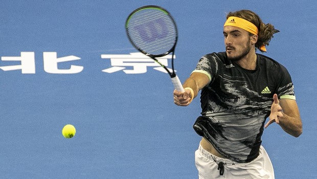Stefanos Tsitsipas of Greece hits a return shot while competing against Dominic Thiem of Austria during the men's final at the China Open tennis tournament in Beijing, Sunday, Oct. 6, 2019. (AP Photo/Ng Han Guan)