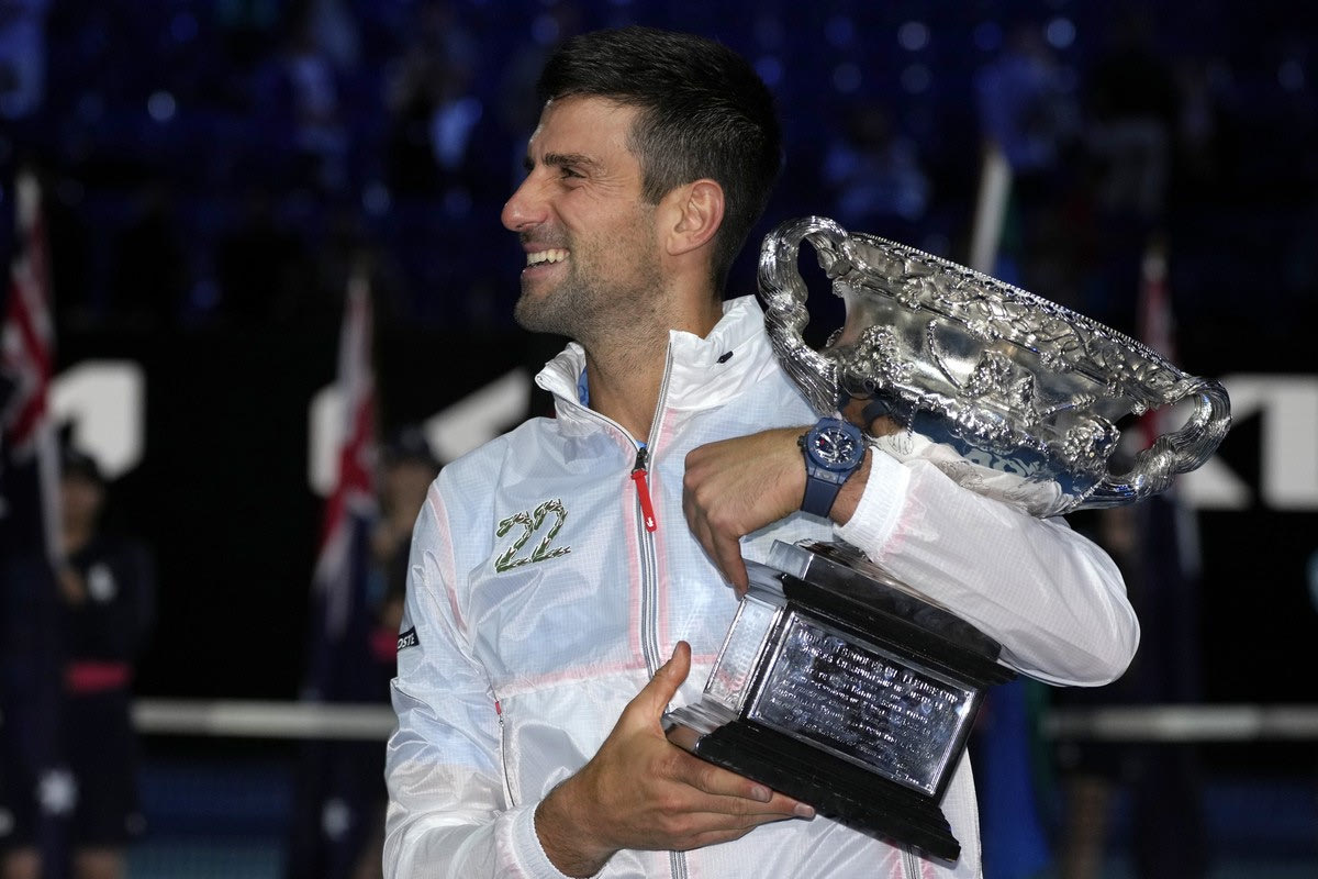Novak Djokovic of Serbia reacts as he holds the Norman Brookes Challenge Cup after defeating Stefanos Tsitsipas of Greece in the men's singles final at the Australian Open tennis championship in Melbourne, Australia, Sunday, Jan. 29, 2023. (AP Photo/Aaron Favila) AP