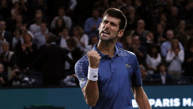 Novak Djokovic of Serbia celebrates after defeating Roger Federer of Switzerland during their semifinal match of the Paris Masters tennis tournament at the Bercy Arena in Paris, France, Saturday, Nov. 3, 2018. (AP Photo/Thibault Camus)
