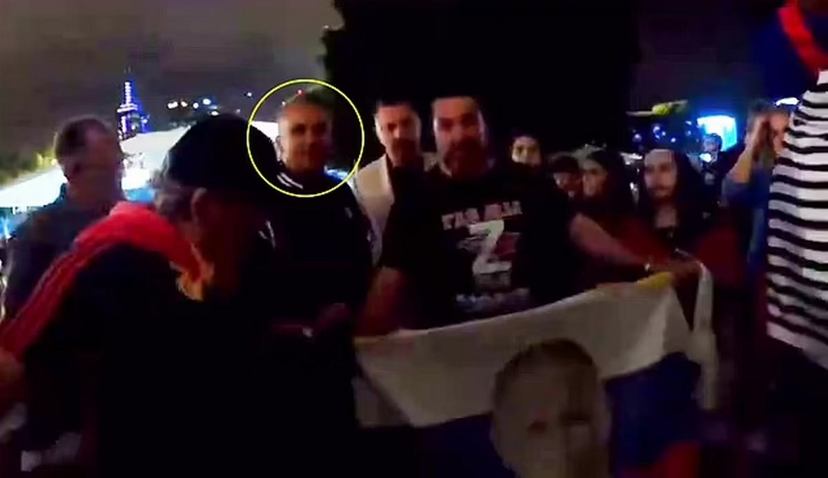 Αυτό που ενόχλησε ωστόσο, ήταν ότι κράτησε τη σημαία της Ρωσίας, η οποία πάνω είχε το πρόσωπο του προέδρου της χώρας, Βλαντιμίρ Πούτιν, τη στιγμή που ένας εκ των Ρώσων υποστηρικτών φώναζε: “Ζήτω η Ρωσία”.