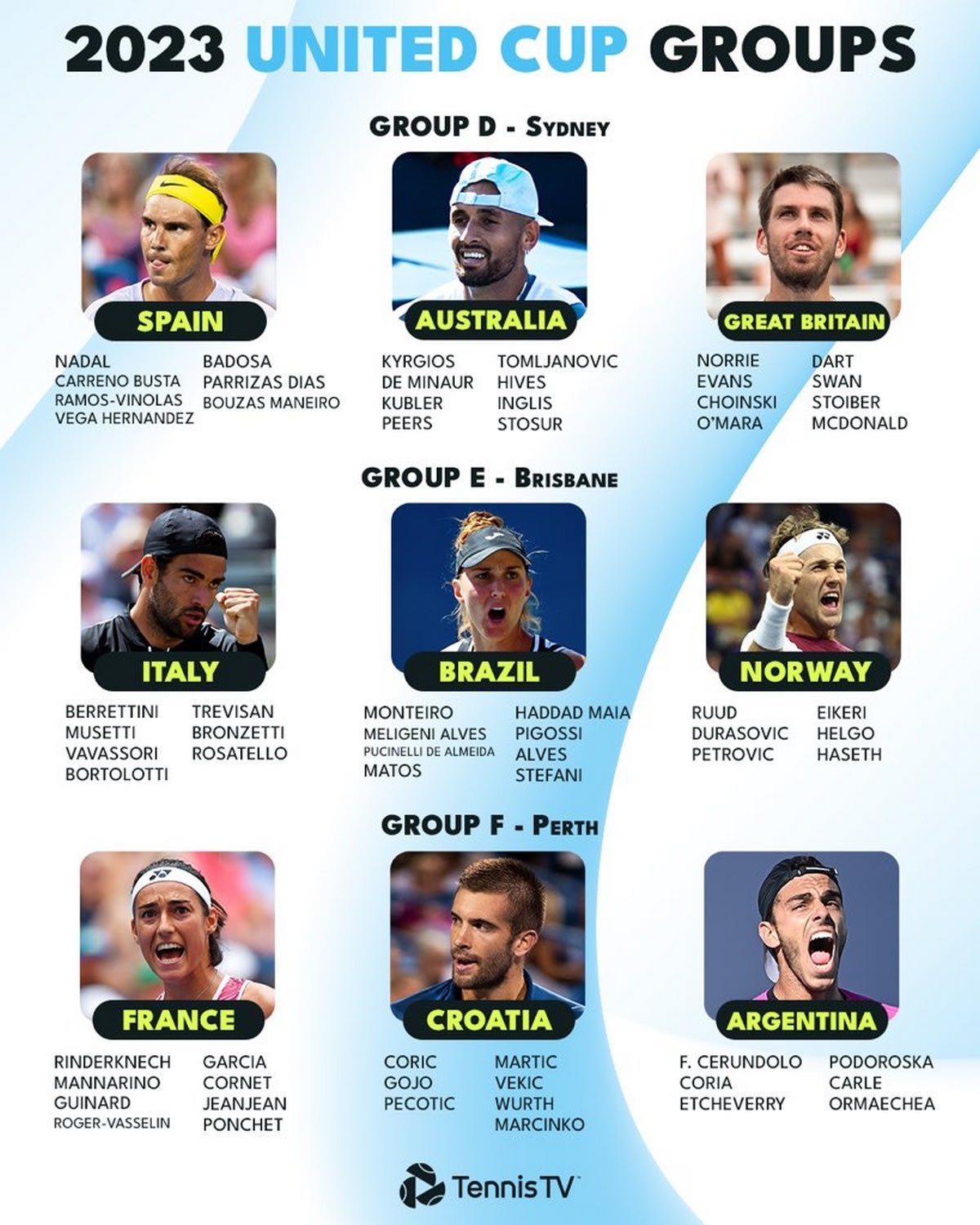 Όχι, βέβαια, ότι πάει πίσω η Ισπανία, που με Ναδάλ, Καρένιο Μπούστα και Μπαντόσα, αναμένεται να διεκδικήσουν σπουδαία διάκριση, ξεκινώντας από το απαιτητικό Group D, στο οποίο βρίσκεται η Μεγάλη Βρετανία του Κάμερον Νόρι και η Αυστραλία του Νικ Κύργιου.