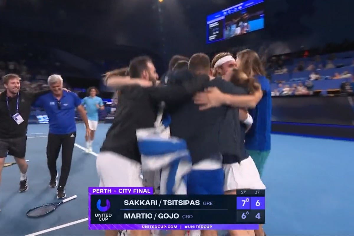 Μετά τη νίκη της Μαρίας Σάκκαρη και του Στέφανου Τσιτσιπά στο διπλό που σφράγισε την πρόκριση στα ημιτελικά του United Cup όλα τα μέλη της ελληνικής αποστολής έγιναν ένα κουβάρι.