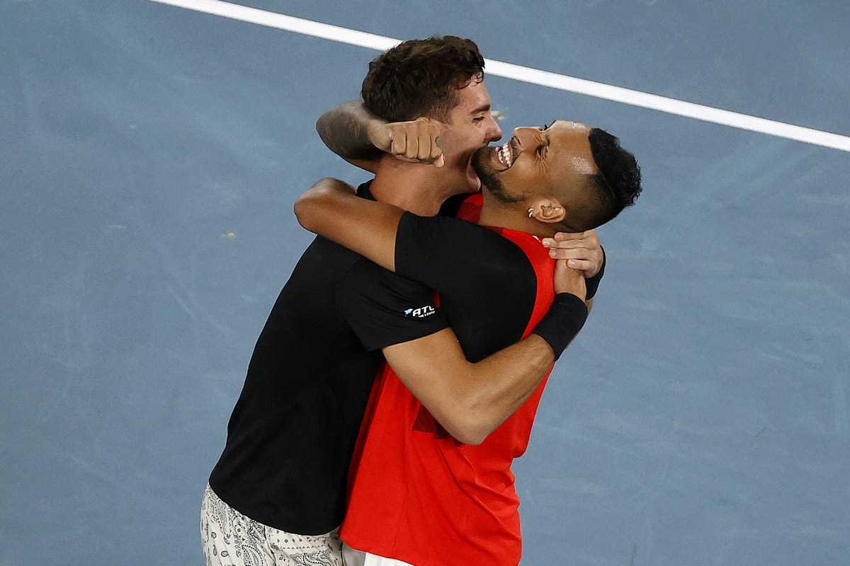 Οι Κύργιος και Κοκκινάκης πανηγυρίζουν την κατάκτηση του Australian Open 2022 AP Photo/Tertius Pickard