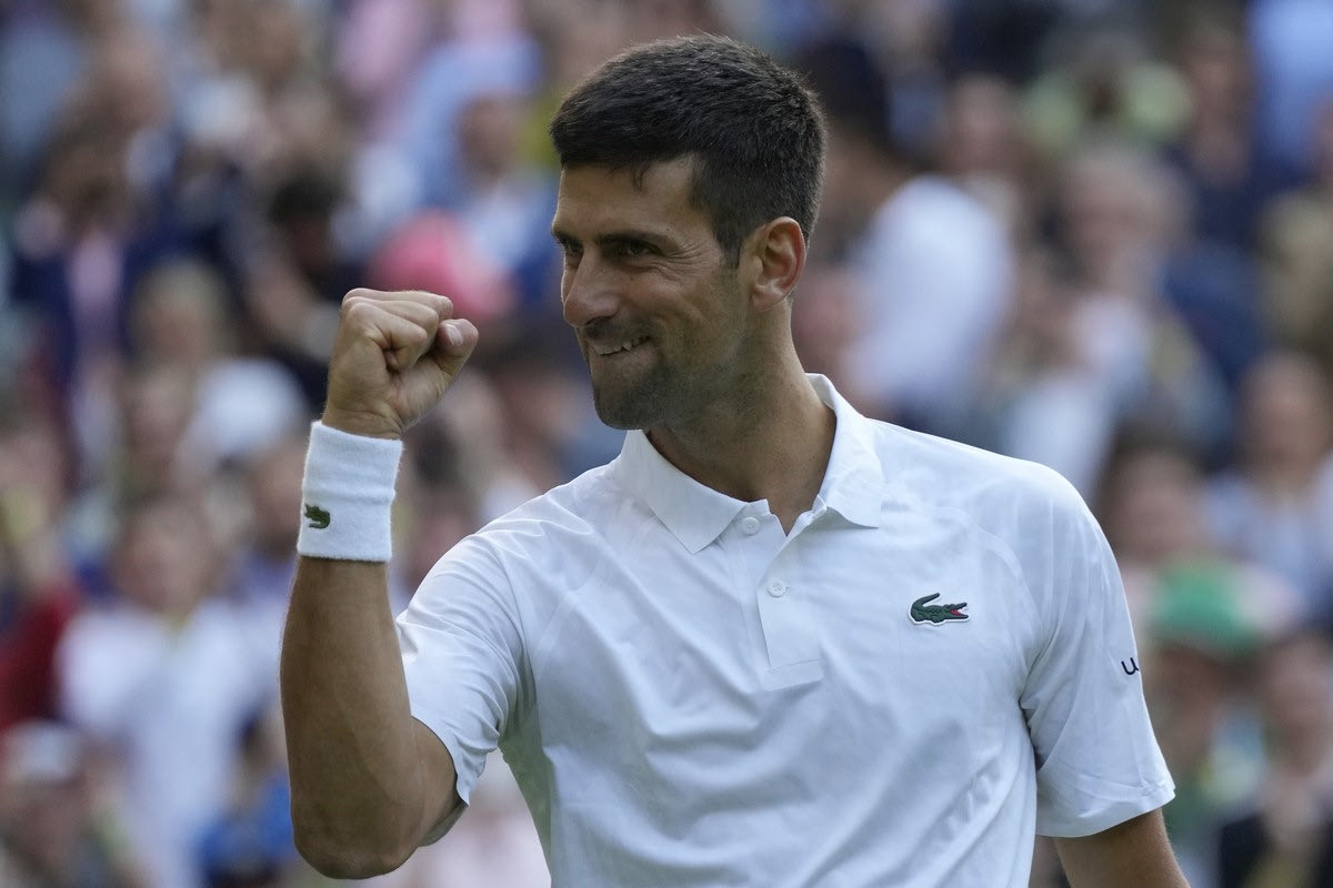Serbia's Novak Djokovic celebrates defeating Australia's Jordan Thompson in the men's singles match on day three of the Wimbledon tennis championships in London, Wednesday, July 5, 2023. (AP Photo/Alastair Grant)