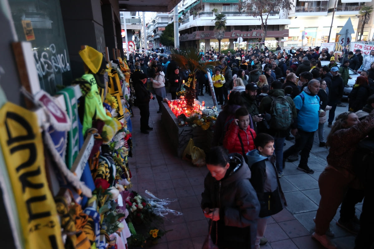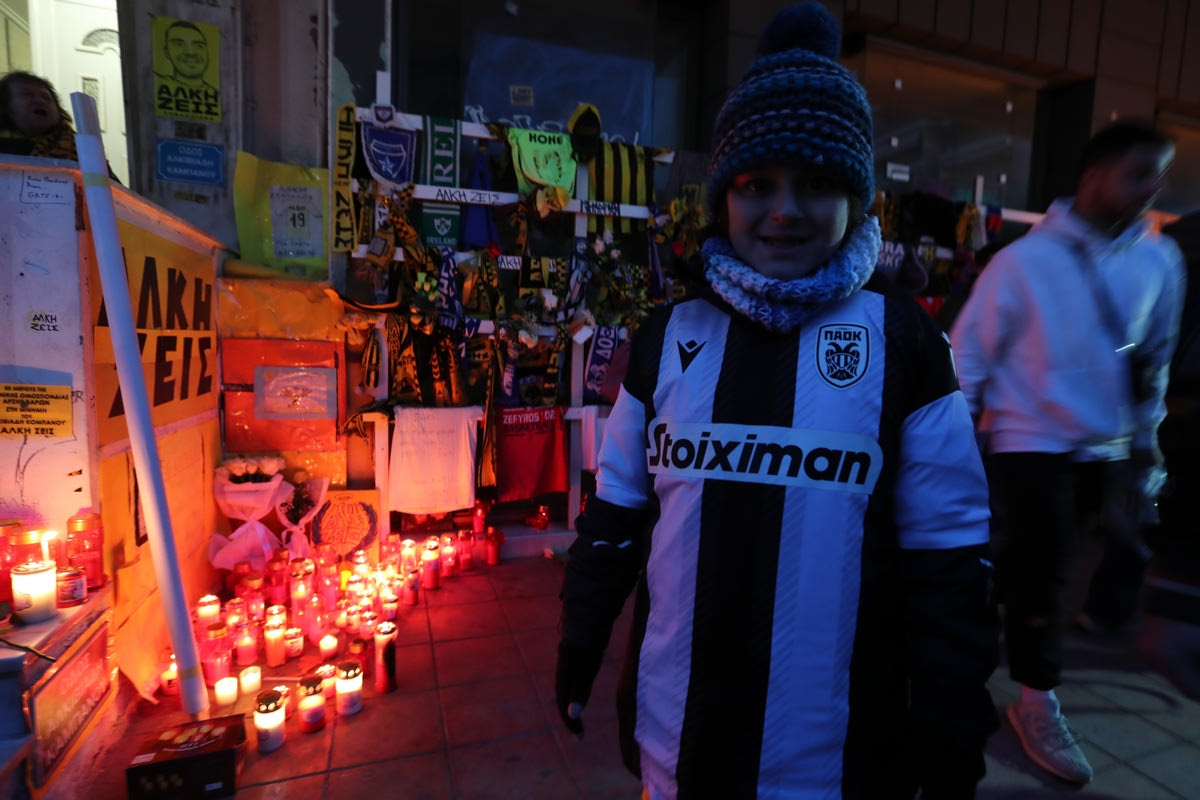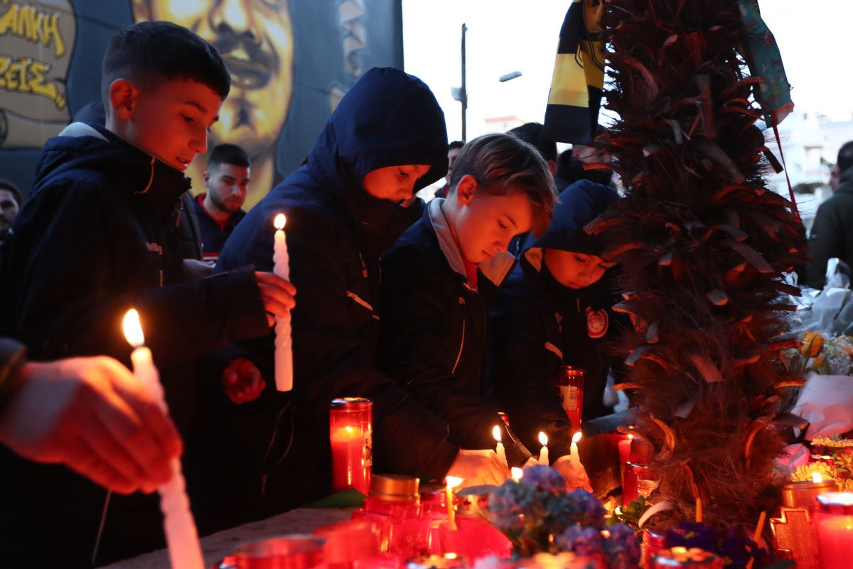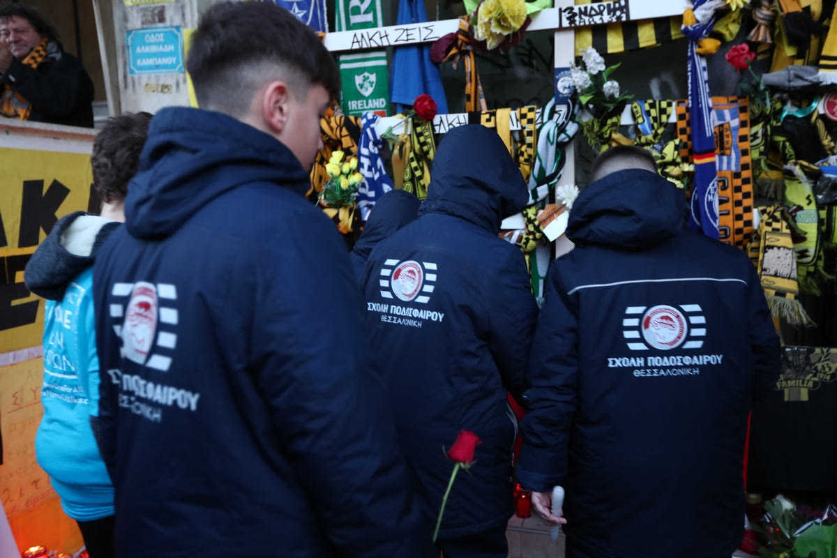 Μικρά παιδιά, αντιπροσωπεία ποδοσφαιριστών του Άρη, φίλαθλοι όλων των ομάδων βρέθηκαν στο σημείο, άναψαν κεριά στη μνήμη του Άλκη Καμπανού και φώναξαν με δυνατή φωνή αφού αρχικά κράτησαν ενός λεπτού σιγή: “Άλκη ζεις και δεν θα ξεχαστείς”.