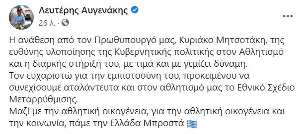 “Η ανάθεση από τον Πρωθυπουργό μας, Κυριάκο Μητσοτάκη, της ευθύνης υλοποίησης της Κυβερνητικής πολιτικής στον Αθλητισμό και η διαρκής στήριξή του, με τιμά και με γεμίζει δύναμη.