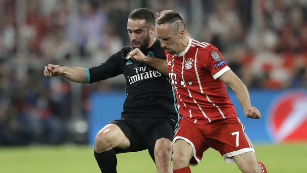Real Madrid's Daniel Carvajal, left, and Bayern's Franck Ribery challenge for the ball during the semifinal first leg soccer match between FC Bayern Munich and Real Madrid at the Allianz Arena stadium in Munich, Germany, Wednesday, April 25, 2018. (AP Photo/Matthias Schrader)