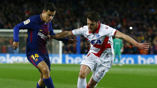 FC Barcelona's Coutinho, left, duels for the ball against Alaves' Ibai Gomez during the Spanish La Liga soccer match between FC Barcelona and Alaves at the Camp Nou stadium in Barcelona, Spain, Sunday, Jan. 28, 2018. (AP Photo/Manu Fernandez)