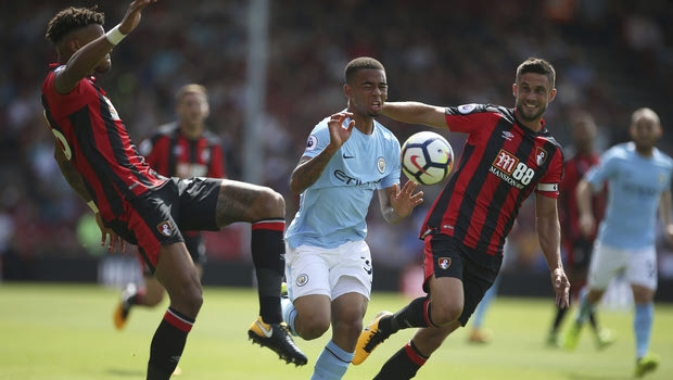 Manchester City's Gabriel Jesus, centre, battles with AFC Bournemouth's Tyrone Mings, left, and Andrew Surman during the English Premier League match, Bournemouth versus Manchester City, at the Vitality Stadium, Bournemouth, England, Saturday Aug. 26, 2017. (Steven Paston/PA via AP)