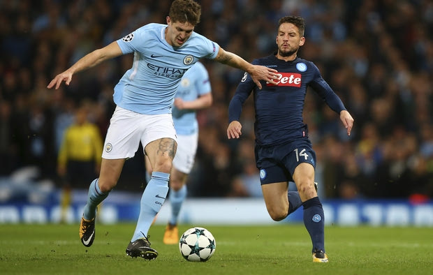 Manchester City's John Stones, left, challenges for the ball with Napoli's Dries Mertens during the Champions League group F soccer match between Manchester City and Napoli at the Etihad Stadium in Manchester, England, Tuesday, Oct.17, 2017. (AP Photo/Dave Thompson)