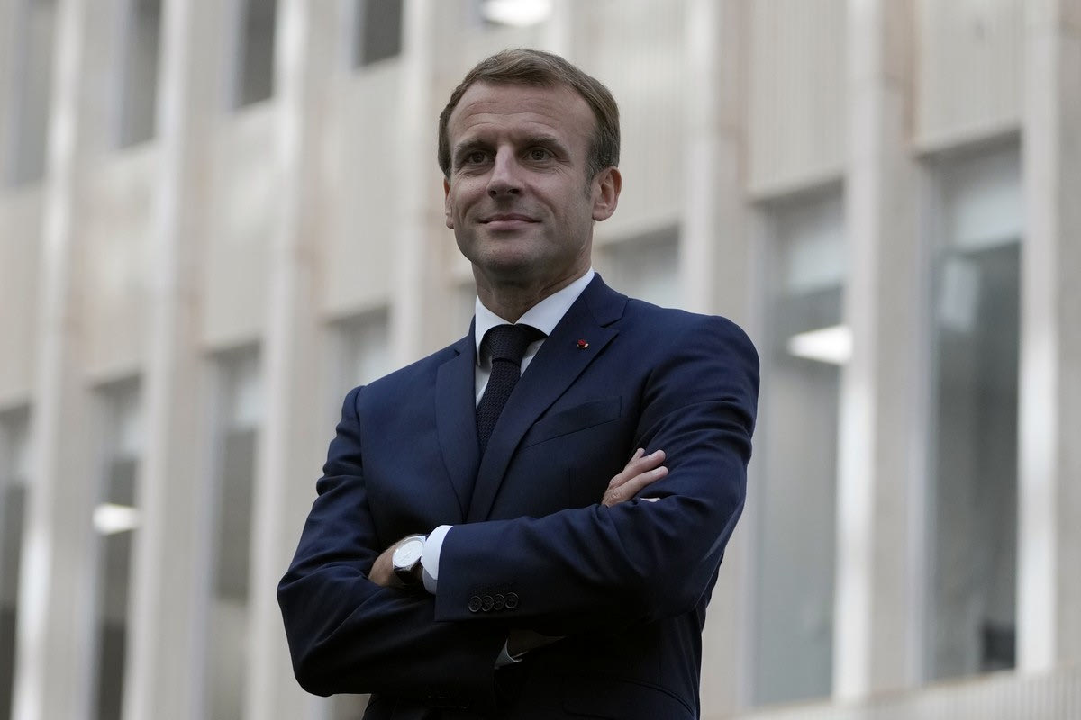 French President Emmanuel Macron arrives with Head of Paris 2024 Tony Estanguet to talk to staff members at the headquarters of the Paris 2024 Organizing Committee, in Saint Denis, outside Paris, Thursday, Oct.14, 2021. French President Emmanuel Macron said Thursday that the government will help fund 5,000 local facilities to allow more people to practice sports, especially in the country's poorest areas, ahead of the Paris 2024 Olympics. (AP Photo/Francois Mori, Pool) AP