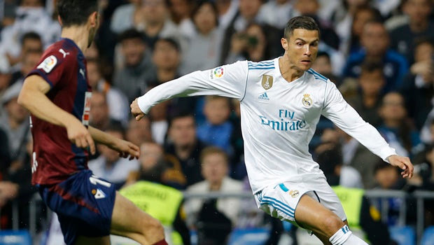 Real Madrid's Cristiano Ronaldo, right, vies for the ball with Eibar's Paulo Oliveira during the Spanish La Liga soccer match between Real Madrid and Eibar at the Santiago Bernabeu stadium in Madrid, Sunday, Oct. 22, 2017. (AP Photo/Francisco Seco)