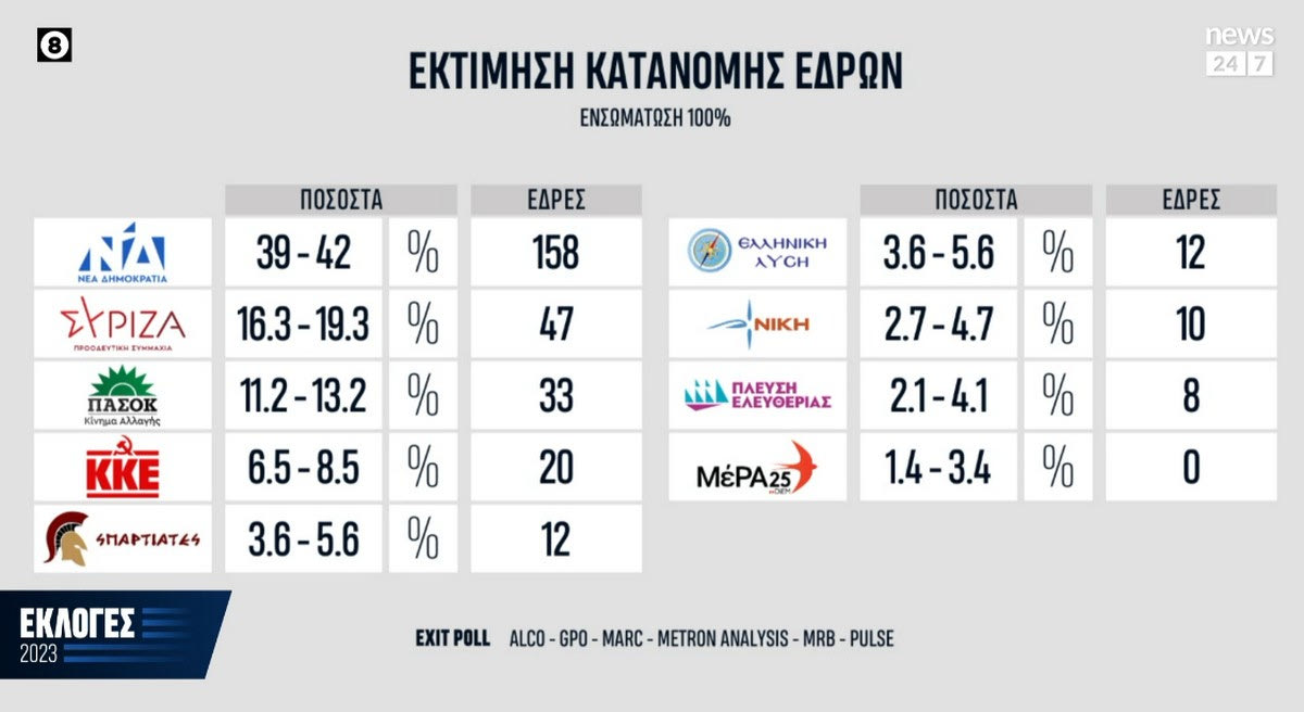 Με το κλείσιμο της κάλπης σε όλη τη χώρα, στη δημοσιότητα δόθηκε το exit poll των ιδιωτικών καναλιών για τις βουλευτικές εκλογές 2023.